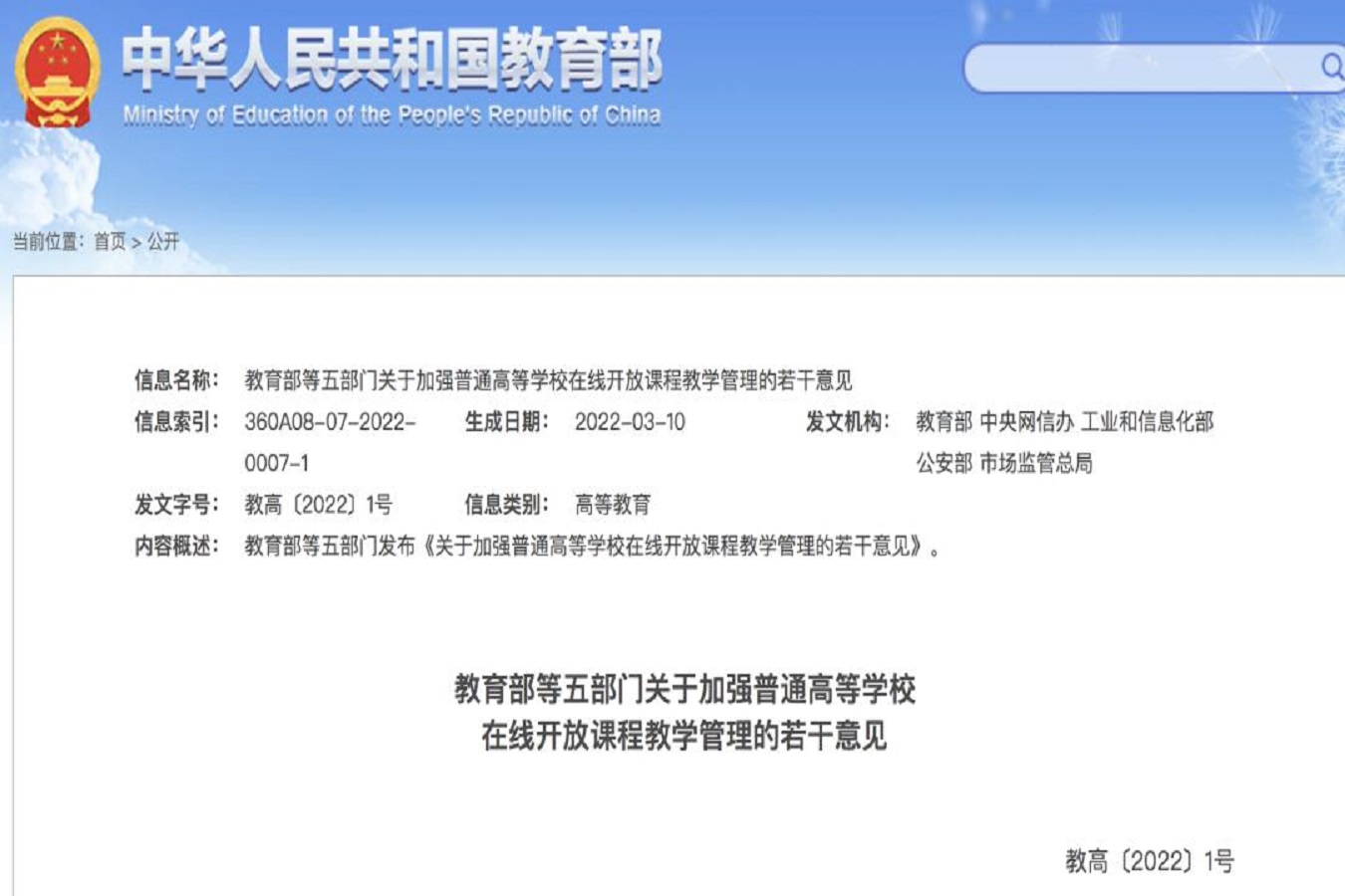 4月1日,教育部网站发布了《教育部等五部门关于加强普通高等学校在线开放课程教学管理的若干意见》,明确就加强高校用以认定学分的在线开放课程教学管理提出意见。